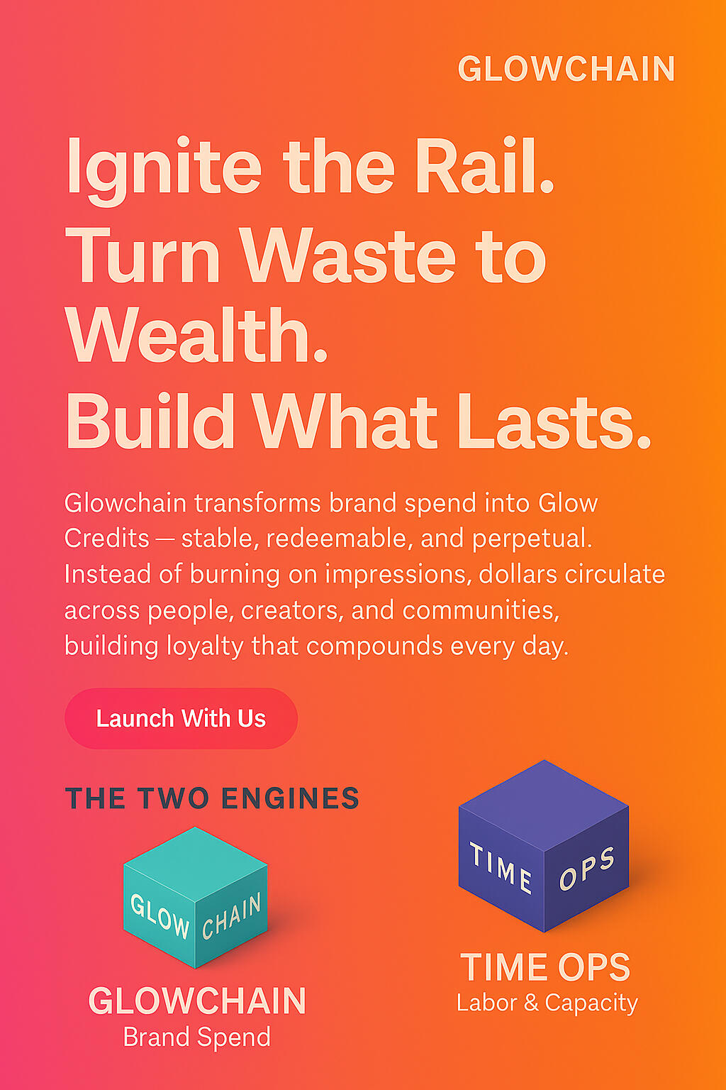 For Brands: Measurable goodwill, not wasted impressions.For People: Every Spark is a ride, a meal, a class, a concert — a real benefit.For Communities: Sparks activate networks — churches, schools, athletes, creators — turning budgets into living energy.The inevitable rails. TimeOps redeems human capacity. Glowchain redeems wasted capital. Together, they form the dual rails every stakeholder must build on. This is not optional — it is existential.